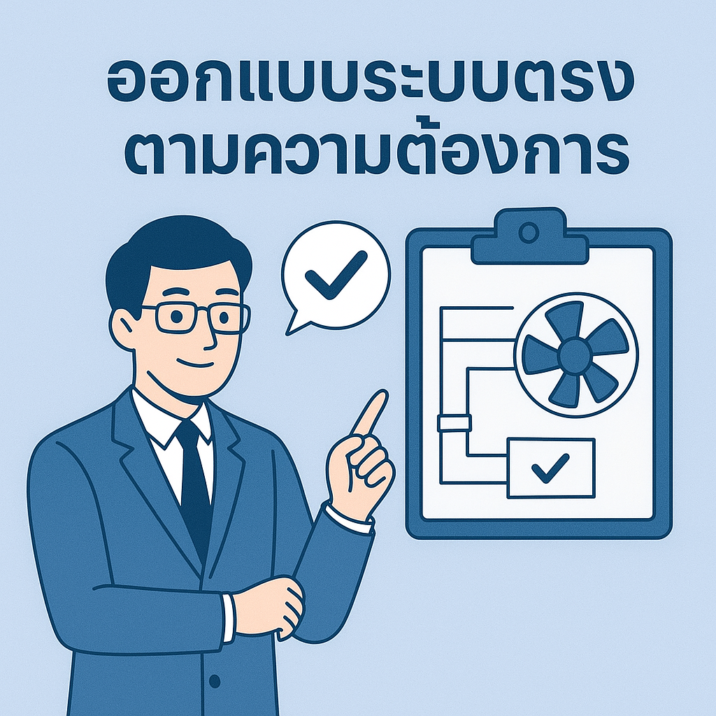 เราออกแบบระบบระบายอากาศแบบครบวงจร โดยคำนึงถึงเงื่อนไขการใช้งานจริงและสภาพแวดล้อมของสถานที่ เพื่อให้ได้โซลูชันที่เหมาะสมที่สุดสำหรับลูกค้าแต่ละราย